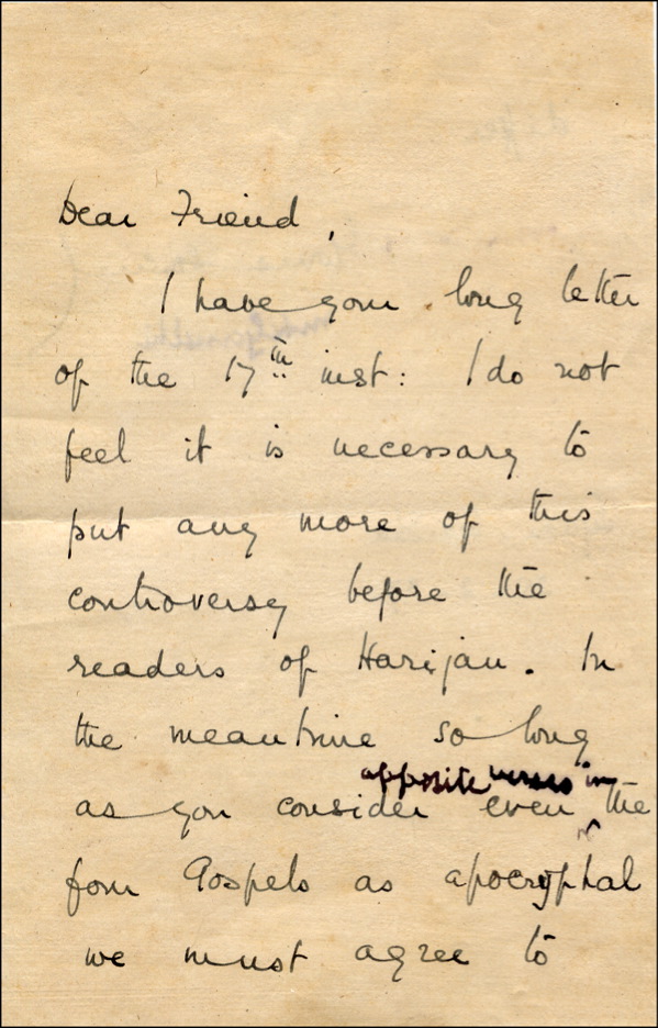 Gandhi bluntly defends The New Testatment: “So long as you consider even opposite verses in the four Gospels as apocryphal we must agree to differ”