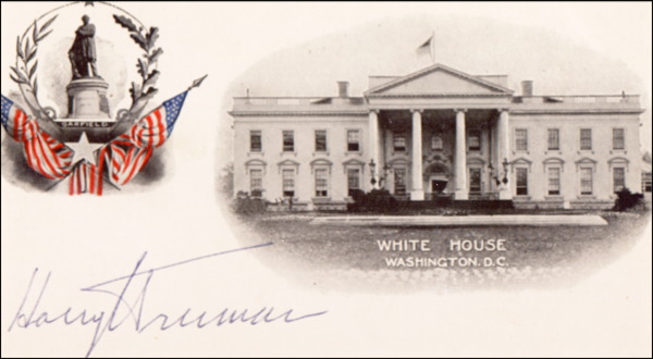 Off-white 5 x 3 card, bearing a nice White House vignette and a colorful Garfield memorial, signed in ballpoint, “Harry S. Truman.” Double matted and framed with a color portrait of Truman, to an overall size of 14 x 21. In fine condition. R&R COA.