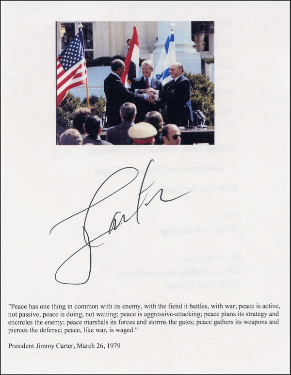 Souvenir TQS on a 4.75 x 6.25 off-white sheet. A quote taken from Carter’s 1979 speech regarding the Camp David accord. Quote reads, “Peace has one thing in common with its enemy, with the fiend it battles, with war; peace is active, not passive; peace is doing, not waiting; peace is aggressive attacking; peace plans its strategy and encircles the enemy; peace marshals its forces and storms the gates; peace gathers its weapons and pierces the defense; peace, like war, is waged.” Signed above the quote in black ink “J. Carter,” with a photo of Carter, Sadat and Begin above the signature. In fine condition. R&R COA.