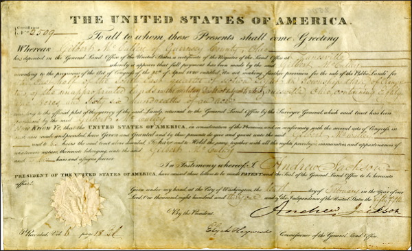 Vellum DS as president, one page, 15.5 x 9.75, February 10, 1831. Jackson grants eighty one acres of land in Ohio to Gilbert McCulley, boldly signed at the conclusion in brown ink by Jackson and countersigned by the Commissioner of the General Land Office Elijah Haywood. In very good condition, with two heavy vertical folds, one through opening stroke of Jackson’s signature, worn but intact seal, scattered toning and staining, and a few small pinholes to document, none affecting large six inch signature. COA John Reznikoff/PSA/DNA and R&R COA.