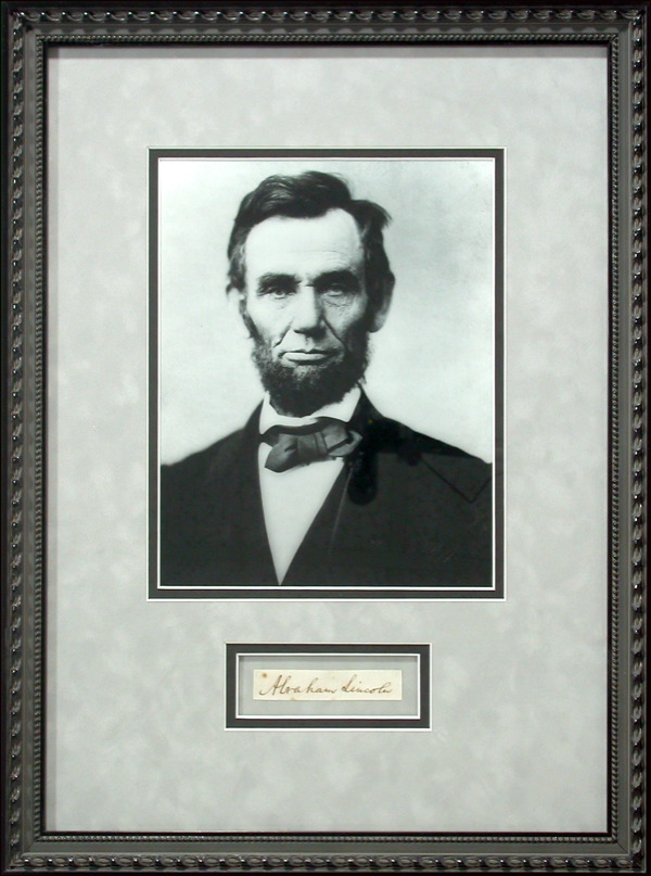Ink signature, “Abraham Lincoln,” on an off-white 3.25 x 1 slip. Archivally double matted and framed with a distinguished portrait of Lincoln, to an overall size of 14.25 x 19.5. In fine condition, with a few light spots, not affecting signature. COA John Reznikoff/PSA/DNA and R&R COA.