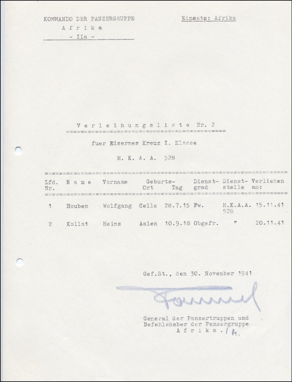 German field Marshall, nicknamed The Desert Fox for his tactical genius as Commander of the Afrika Korps. In 1944 he was implicated in a plot to assassinate Hitler; given the choice of suicide or trial, he took poison. DS, in German, boldly signed in blue pencil “Rommel,” one page, 8.25 x 10.75, Kommando Der Panzergruppe letterhead, November 30, 1941. General Rommel nominates two soldiers for the Iron Cross, First Class. Signed at the conclusion in blue pencil by Rommel. In fine condition, with two punch holes to left edge. COA John Reznikoff/PSA/DNA and R&R COA.