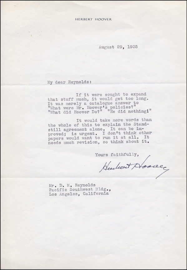 TLS, one page, 7.5 x 10.5, personal letterhead, August 29, 1935. In part: “If it were sought to expand that stuff much, it would get too long. It was merely a catalogue answer to ‘What were Mr. Hoover’s policies?’ ‘What did Hoover Do?’ ‘He did nothing!’ It would take more words that the whole of this to explain the Stand-still agreement alone. It can be improved; is urgent. I don’t think other papers would want to run it at all. It needs much revision, so think about it.” In fine condition, with a horizontal fold skirting one letter of the signature, light edge toning. R&R COA.