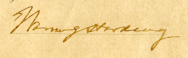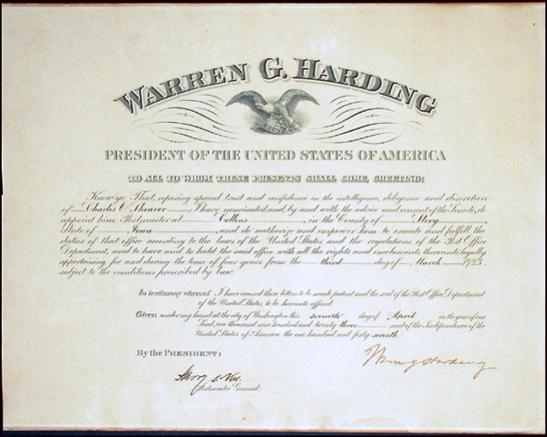 DS as president, one page, 17.75 x 14, April 7, 1923. President Harding appoints Charles Shearer to the position of Postmaster at Collins, Iowa. Signed at the bottom in fountain pen by Harding and countersigned by his Postmaster General. In very good condition, with even overall toning to document, a bit heavier at edges, small water spots along bottom edge and a nice signature. R&R COA.