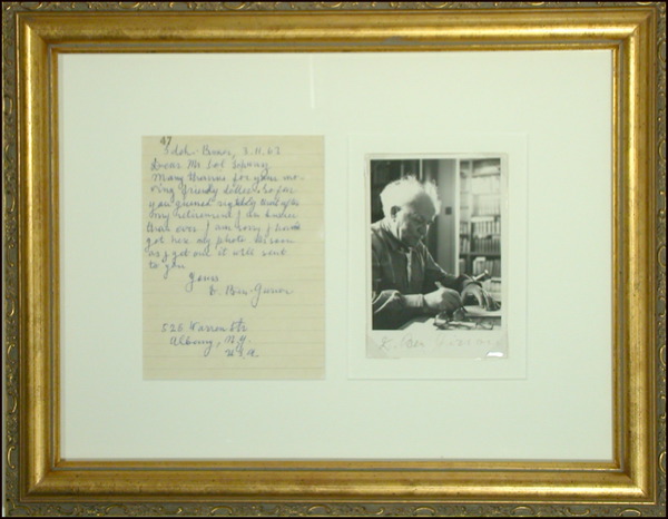 ALS signed “D. Ben-Gurion,” one page, 4.5 x 6, March 11, 1963. Letter to Sol Schwartz. In full, “Many thanks for your moving friendly letter. So far you guessed rightly that after my retirement I am busier than ever. I am sorry I haven’t got here my photos. As soon as I get one it will be sent to you.” Letter is matted and framed with a 3.5 x 5 glossy photo of Ben-Gurion, signed in the lower border in black ink “D. Ben-Gurion,” to an overall size of 16.5 x 13. In fine condition, with light mailing folds and wrinkles, small stamp to top left and a trivial area of paper loss to right edge. R&R COA.