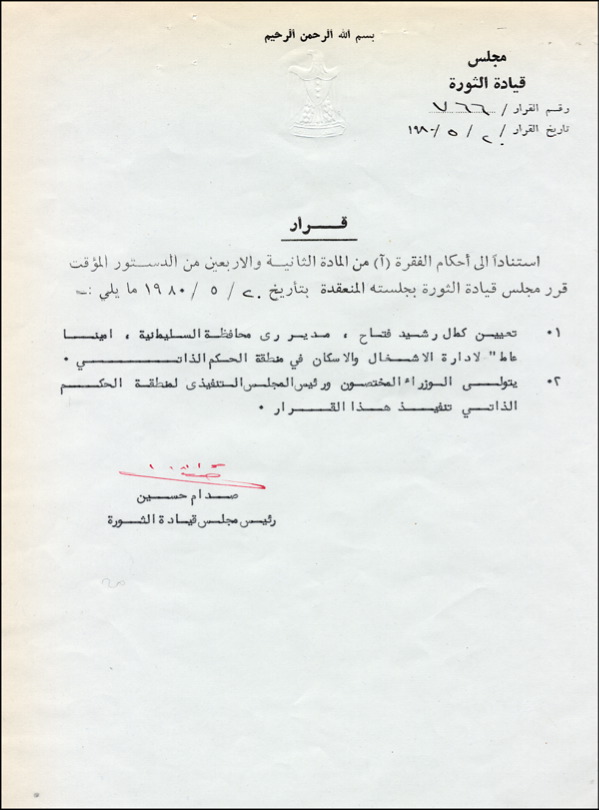 DS, in Arabic, one page, 8.5 x 11, Revolution’s Supreme Council letterhead, May 20, 1980. According to Line A of Section 42 of the temporary constitution, the Revolution Leadership Commission decided the following in its meeting: 1) Kamal Rashid Fatah, Director of the Water Department of the Sulimanian governate, will be assigned as General Manager of the Housing & Construction Department for the Ontonomi region. 2) The Specialist Ministers and President of the Autonomi commission will handle said procedures. Signed at the conclusion in red ink by Hussein. In fine condition, with some light toning to top and right edge. R&R COA.