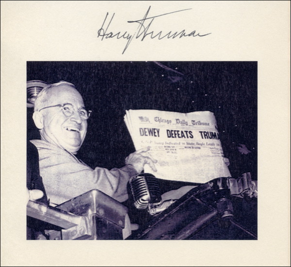 Off-white 6.25 x 5.75 sheet bearing an image of Truman holding up the memorable “Dewey Defeats Truman” issue of the Chicago Tribune, signed in the top border in black ink. In fine condition. Note: the sheet was signed by Truman years ago, while the image was added more recently. R&R COA.