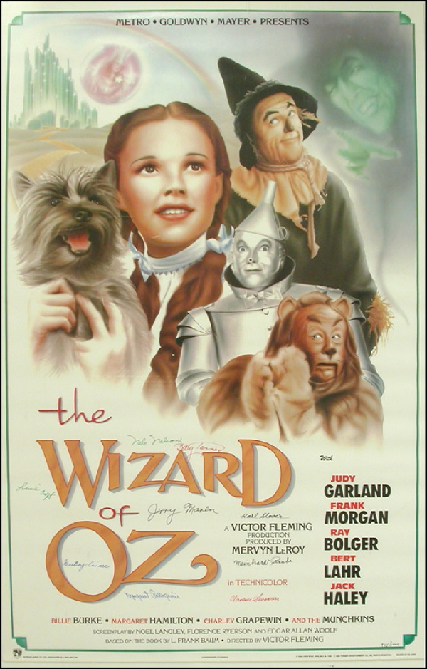 Color 22 x 34 poster for the Wizard of Oz, signed in felt tip by nine Munchkins. Signers are: Nels Nelson, Betty Tanner, Mickey Carroll, Margaret Pellegrini, Jerry Marren, Carl Slover, Meinhardte Raabe, Clarence Swenson and Lewis Croft. Rolled and in fine condition, with light rippling to edges. R&R COA.