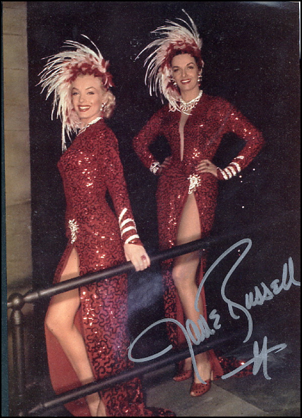 Color matte-finish 8 x 11.5 magazine photo of Russell and Marilyn Monroe in matching red-sequined dresses from the film Gentlemen Prefer Blondes, signed in silver ink. In fine condition, with scattered light creasing and roughly trimmed edges. R&R COA.