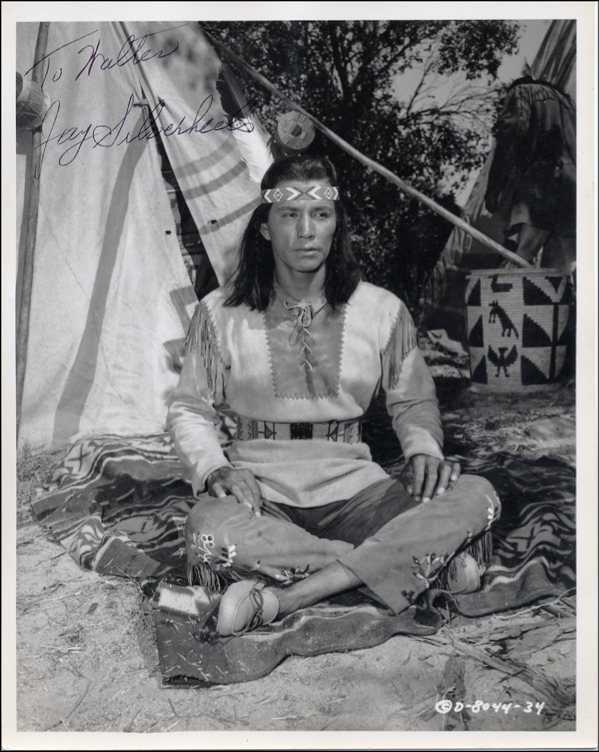Familiar Canadian Indian actor who shot to fame as Tonto, the faithful Indian companion of the masked man on the television series The Lone Ranger. Glossy 8 x 10 cardstock full-length photo of Silverheels as the great Shawnee chief, Tecumseh, from the film Brave Warrior, signed and inscribed in black ink “To Walter, Jay Silverheels.” In fine condition, with studio information on the reverse. R&R COA.