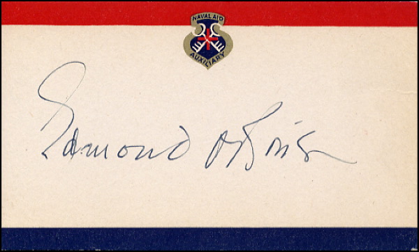 Ink signature on an off-white 5 x 3 Naval Aid Auxiliary card. Accompanied by an unsigned 8 x 10 photo of the actor. In fine condition, with slight toning. R&R COA.