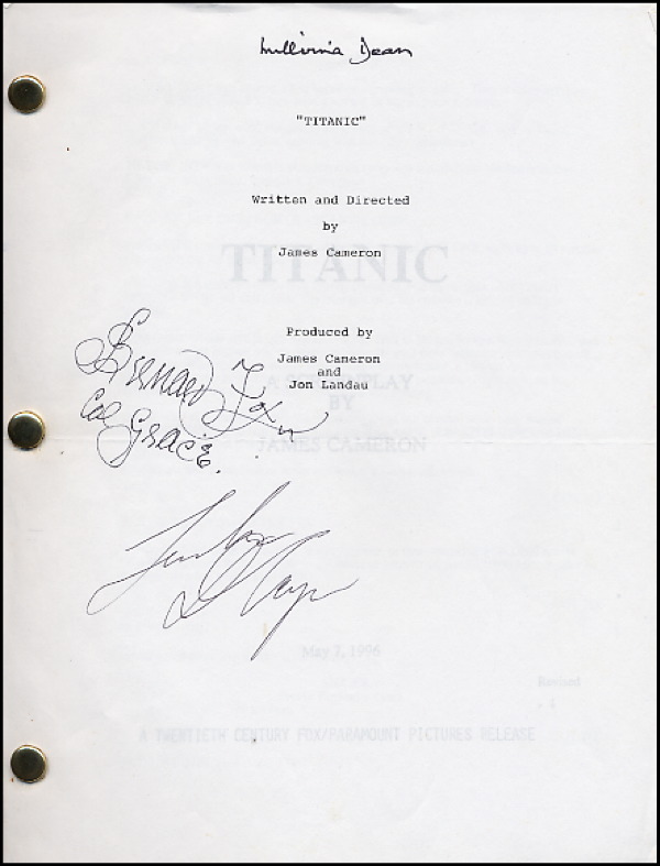 Copy of the original script for the film Titanic, 289 pages, signed on the cover in ink by Bernard Fox, Leonardo DiCaprio, and Millvina Dean. In fine condition, with slight bends of a few corners. R&R COA.