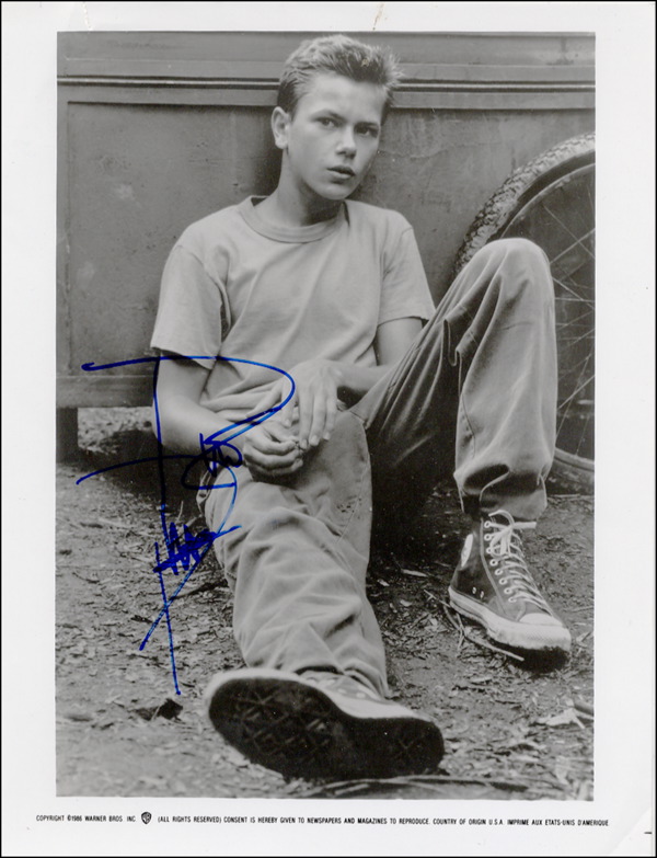 Young actor who died tragically at the age of 23 after overdosing on heroin and cocaine. Glossy 8 x 10 Warner Bros. promotional photo of Phoenix in Stand By Me, signed in-person in blue felt tip. Obtained in person by New York City collector Blake Levine. In fine condition. R&R COA.
