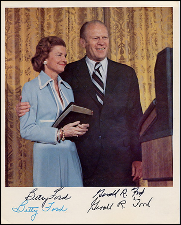 Color 8 x 10 cardstock photo, signed in-person in black felt tip by Gerald and Betty Ford, each signing near their printed signatures. Obtained in person by New York City collector Blake Levine. In fine condition. R&R COA.