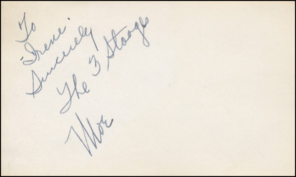 Fountain pen signature and inscription, “To Irene, Sincerely, The 3 Stooges, Moe,” on an off-white 5 x 3 card. In fine condition, with a touch of light edge toning. R&R COA.