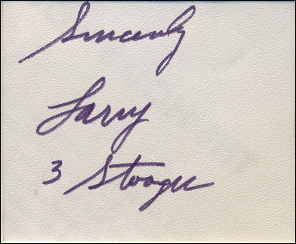 Felt tip signature, “Sincerely, Larry, 3 Stooges,” on an off-white slip. Matted to an overall size of 3.5 x 3.25, clipped from a larger piece. In fine condition. R&R COA.