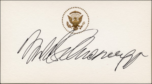 Ink signature, “Arnold Schwarzenegger,” on an off-white 4.25 x 2.25 embossed card bearing a raised gold seal. Obtained at a Business Roundtable Luncheon sponsored by Californians for Schwarzenegger 2006. In fine condition, with a minor brush to last name of signature. R&R COA.