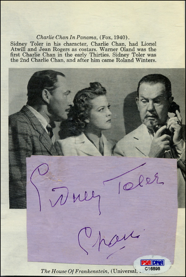 Ink signature, “Sidney Toler - Chan,” on a purple 4 x 3 album page. In fine condition, with lightly trimmed edges and an affixed PSA/DNA sticker to the bottom edge. COA PSA/DNA and R&R COA.