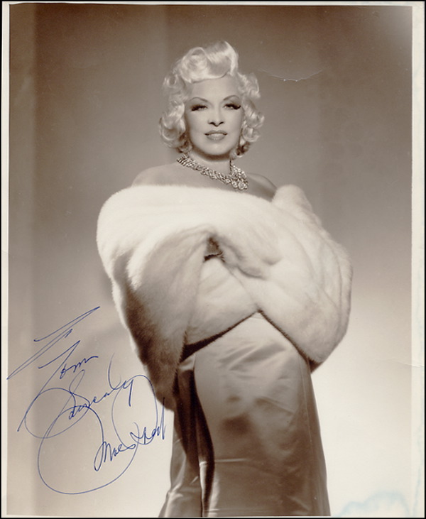 Classic vintage matte-finish 8 x 10 photo of West draped in white fur and a diamond choker, signed and inscribed in blue ink “To Tom, Sincerely, Mae West.” In fine condition, with area of faint discoloration from lower right corner and up through right border, couple of corner bends, a couple of faint creases. R&R COA.