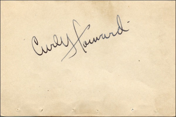 The most popular of the Three Stooges. Made over 100 film appearances after replacing his brother, Shemp. Vintage fountain pen signature “Curly Howard” on an off-white 4.5 x 3 album page. In fine condition, with light toning and several tack holes along bottom. R&R COA.