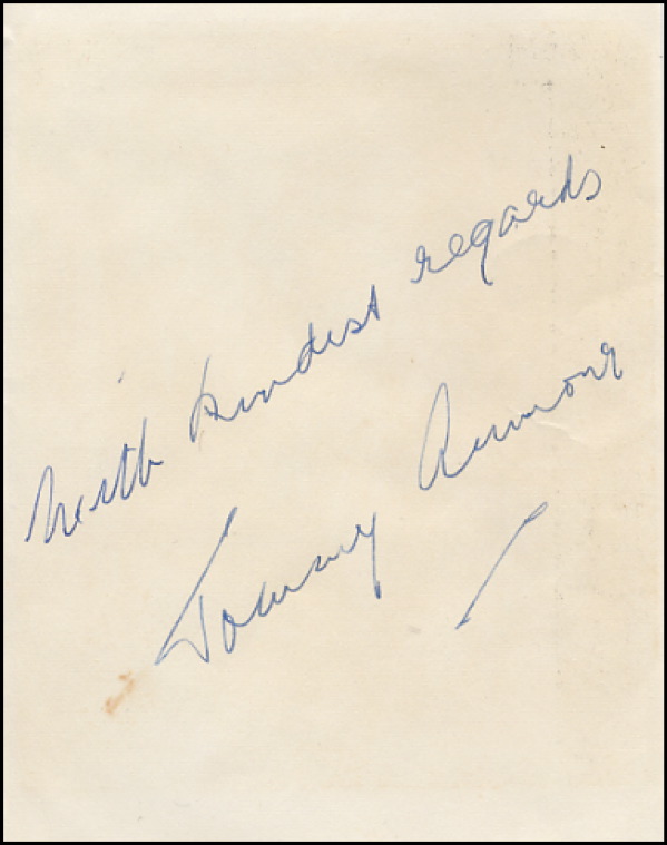 Golfer who lost his sight in one eye during the WWI yet went on to win three of the world’s major tournaments. Vintage ballpoint signature, “With kindest regards, Tommy Armour,” on an off-white 4.25 x 5.75 card. In fine condition, with moderate toning. R&R COA.