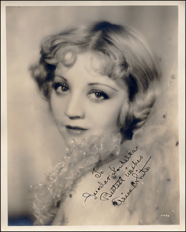 She began her career as a secretary, working for Von Sternberg and Chaplin. She was often miscast as a singer-dancer. She toured in vaudeville after her career’s downturn and returned to Hollywood where she became involved in a sex scandal in 1933 with her boyfriend, actor Jack Warburton and her future husband, Sidney Bartlett. She continued to work on the stage and screen for the next two decades, but a series of divorces, more sex scandals, and an accident in 1957 put an end to her career. Splendid vintage sepia matte-finish 8 x 10 Elmer Fryer portrait of the comely actress, signed and inscribed in fountain pen “To Jaroslav Kondeka, Bestest wishes, Alice White.” In fine condition. R&R COA.