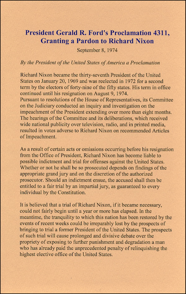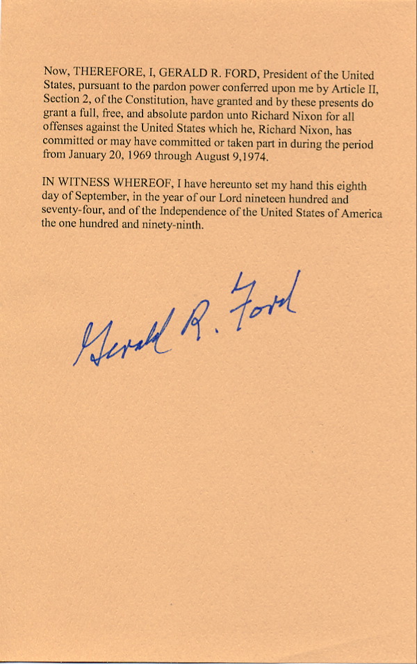 Souvenir typescript of the Nixon pardon, on two gold 5.75 x 9 sheets, signed on the second page “Gerald R. Ford” in blue felt tip. This full transcript includes five paragraphs of the historic pardon. In part: “I, Gerald R. Ford, President of the United States…do grant a full, free, and absolute pardon unto Richard Nixon for all offenses against the United States which he…may have committed or taken part in during the period from January 20, 1969 through August 9, 1974.” In very fine condition. R&R COA.
