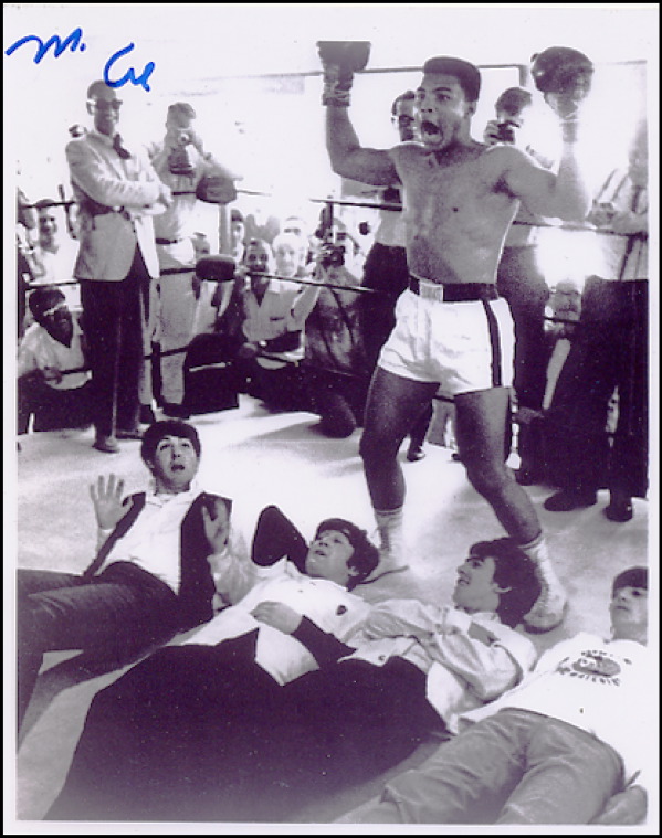 Classic glossy 8 x 10 full-length photo of Ali celebrating after just “knocking out” the Beatles, signed in blue felt tip. In fine condition. COA Steve Grad/PSA/DNA and R&R COA.
