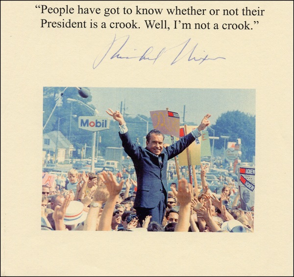 Souvenir TQS on an off-white 6.25 x 6 sheet with a photo of Nixon addressing a large crowd. In full, “People have got to know whether or not their President is a crook. Well, I’m not a crook.” Signed at the conclusion in blue ink, “Richard Nixon.” In fine condition. R&R COA.