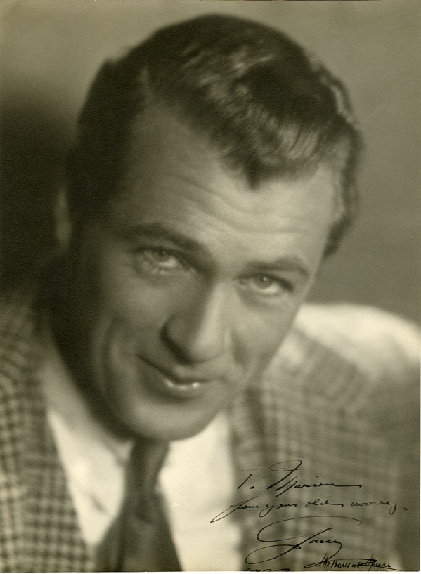 Vintage matte-finish 9.75 x 13.25 head and shoulders Melbourne Spurr photo of Cooper in a jacket and tie, signed and inscribed in fountain pen “To Marion, from your old worry, Gary.” Photo is also signed by Spurr in the lower right corner. In fine condition, with lightly trimmed edges. R&R COA.