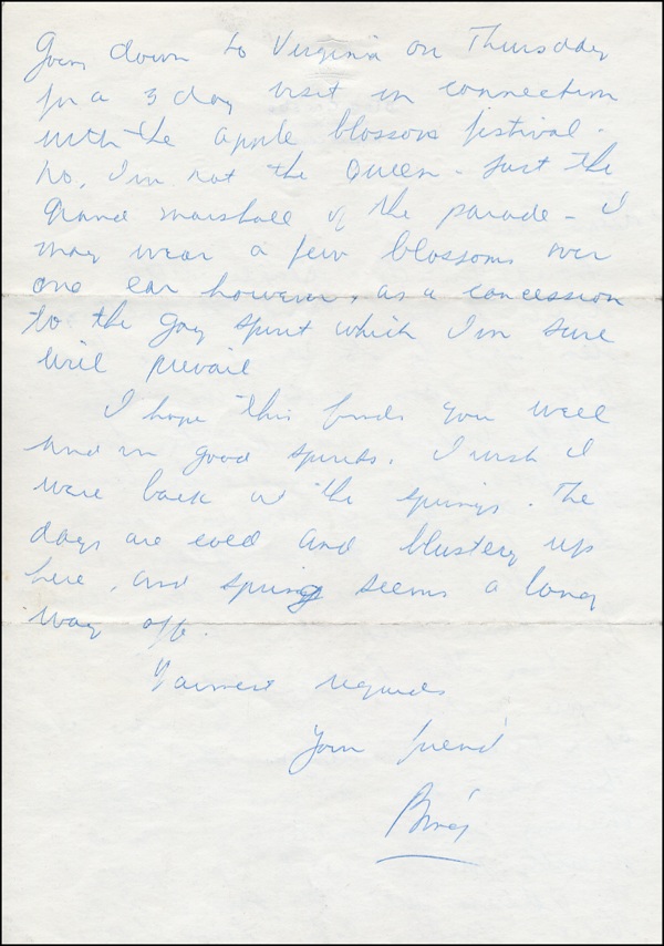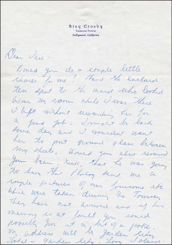 ALS signed “Bing,” one page both sides, 7.25 x 10.5, personal letterhead, no date. Letter to a friend asking a couple of small favors. In part, “Hand the enclosed ten spot to the maid who looked after my room while I was there. I left without rewarding her for a good job. I might be back some day and I wouldn’t want her to put ground glass between my sheets…Going down to Virginia…in connection with the Apple Blossom festival. No - I’m not the queen, just the grand marshal of the parade. I may wear a few blossoms over one ear however, as a concession to the gay spirit which I’m sure will prevail.” In fine condition, with two horizontal mailing folds. R&R COA.