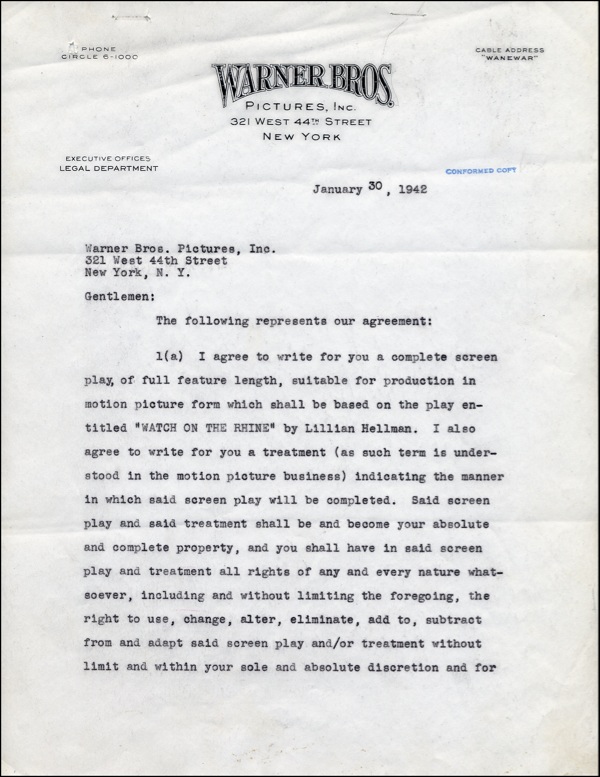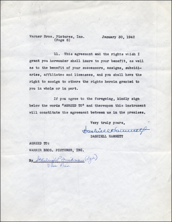 Great American novelist, playwright, screenwriter, author of The Dain Curse, Red Harvest, The Maltese Falcon, The Glass Key, and The Thin Man, etc. DS, eight pages, 8.5 x 11, Warner Bros. Pictures, Inc. letterhead, January 30, 1942. Agreement between Warner Bros. Pictures, Inc. and Hammett, in which Hammett agrees to “write for you a complete screen play of full feature length, suitable for production in motion picture form which shall be based on the play entitled ‘Watch On The Rhine’ by Lillian Hellman. I also agree to write for you a treatment...indicating the manner in which said screen play will be completed.” He goes on to include that the screenplay will be all original and that the treatment will be delivered to Warner Bros. before February 16, 1942, with the screenplay following in two months. For his services, Hammett will be paid $30,000.00. Neatly signed on the last page by Hammett. In fine condition, staple holes to top left and expected light document wear. COA John Reznikoff/PSA/DNA and R&R COA.