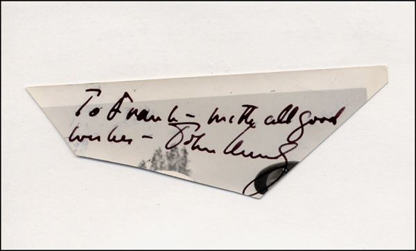 Ink signature, “To Frank - with all good wishes - John Kennedy,” on an irregular 4 x 1.5 piece of black and white photograph. Piece is affixed to a 5 x 3 white card. In very good condition, with unevenly trimmed edges and feathering to the sentiment. COA John Reznikoff/PSA/DNA and R&R COA.