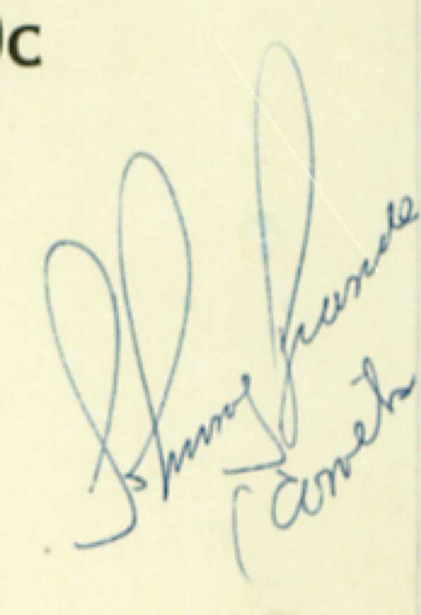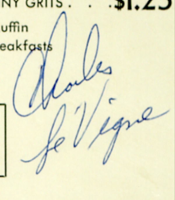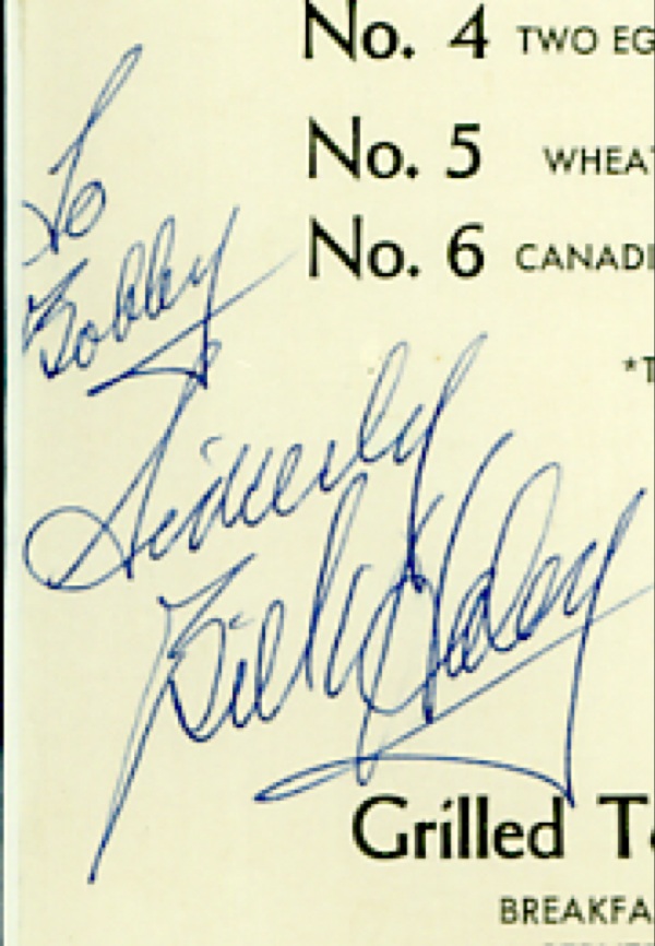 Breakfast menu from an unknown restaurant, 7.75 x 11.5, signed and inscribed in blue ballpoint, “To Bobby, Sincerely, Bill Haley” and also signed by Comets Charles LeVigne and Johnny Grande. Matted and framed with a sheet music cover, to an overall size of 22 x 16. In fine condition, with a bisecting horizontal fold to menu, not affecting any signatures. R&R COA.