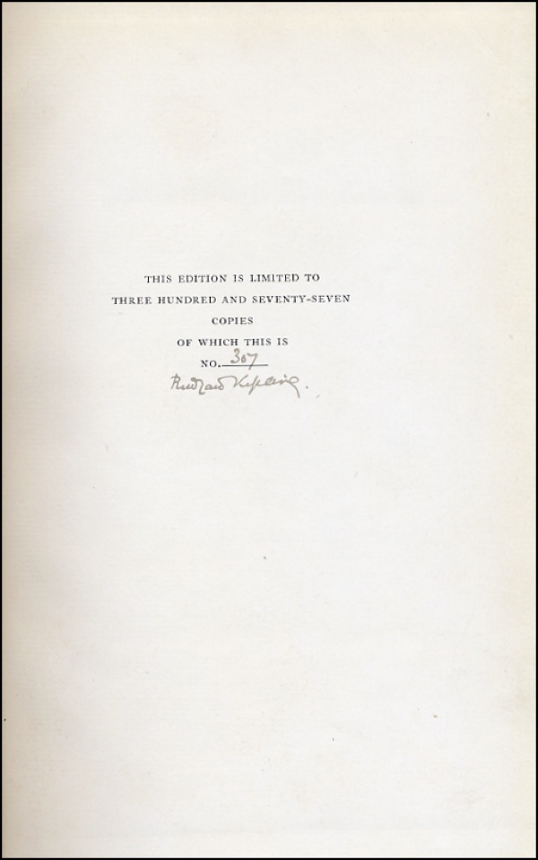 Author of The Jungle Book, Kim, If, etc. Winner of the Nobel Prize for Literature in 1907. Signed book: The Feet of the Young Men. NY: Doubleday, 1920. Hardcover, 6.25 x 9.5. Signed on the limitations page in black ink by Kipling, indicating this is a limited edition of 377 copies, this being number 307. In fine condition, with owners bookplate affixed to inside front cover. R&R COA.