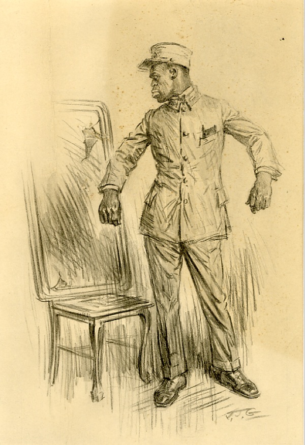 Original signed pencil sketch of Florian Slappey on an off-white 7 x 10 sheet, signed in the lower right “J. J. G.” A note on the reverse, since matted, reads, “This picture may not be used in any newspaper or periodical except the Saturday Evening Post, nor may it be reproduced as an advertisement or in connection with advertising matter.” Double matted to an overall size of 12 x 16. In fine condition. R&R COA.