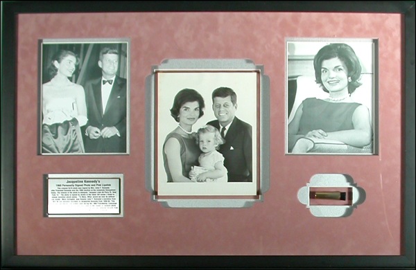 One of Jacqueline Kennedy’s personally owned and used lipstick tubes, acquired from Gallagher. Accompanied by a matte-finish 8 x 10 photo of John and Jacqueline Kennedy posing with Caroline, signed and inscribed in black ink to Kennedy’s secretary Mary Gallagher, “To Mary, What would we ever do without you - Jackie.” Both are impressively suede matted and framed, along with two other photos and an informational plaque, to an overall size of 33.5 x 22. In very good condition, with signature and inscription very faded, but legible and some light rippling to top of photo. R&R COA. Oversized.