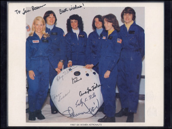 Color 10 x 8 NASA photo of the first six female astronauts, signed in black ink and felt tip by all six: Judith Resnik, Rhea Seddon, Sally Ride, Kathryn Sullivan, Anna Fisher and Shannon Lucid, with one adding a brief inscription to Len. Photo is in a removable lucite holder. In fine condition. R&R COA.