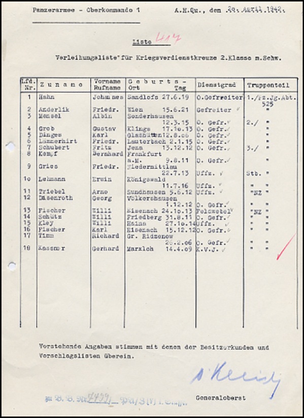 General with overall command of the two Panzer groups. In 1942, appointed to command Army Group A. Died in Russian captivity. DS, in German, signed “v Kleist,” one page, 8.25 x 12, April 20, 1942. Document awarding various decorations to eighteen members of the Panzer Army, signed at the bottom in blue pencil. In fine condition, with punch holes to left edge and a couple small pencil marks. R&R COA.