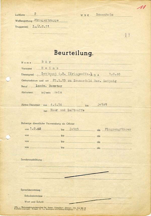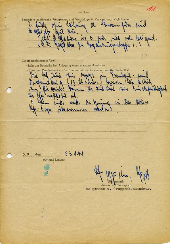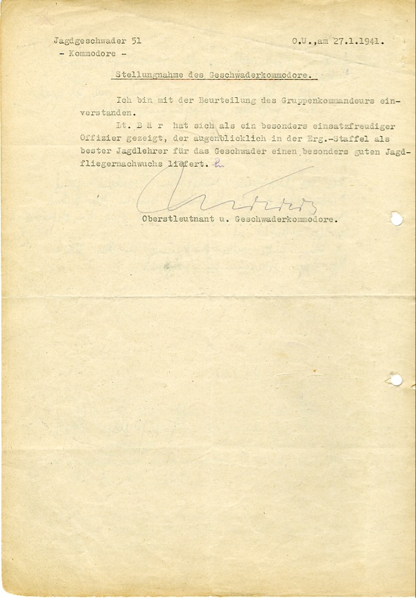 Molders was a World War II fighter ace, originally declared unfit for flying due to repeated nausea and vomiting. Shot down and taken prisoner in 1940, but released two weeks later. Scored over 100 victories and promoted to General and appointed to Inspector General of Fighters. Killed in a plane crash in Germany on his way to attend the funeral of his boss, Ernst Udet. Joppien was a Knight’s Cross with Oak Leaves recipient who was killed in action on August 25, 1941. DS, in German, two pages both sides, 8.25 x 12, January 27, 1941. Four page document regarding Heinz Bar, with a handwritten report by Joppien, who signs at the conclusion and also signed by Werner Molders as Geschwaderkommodore. Expected folds and filing holes, some light toning and wrinkling and a few official notations, otherwise fine condition. R&R COA.