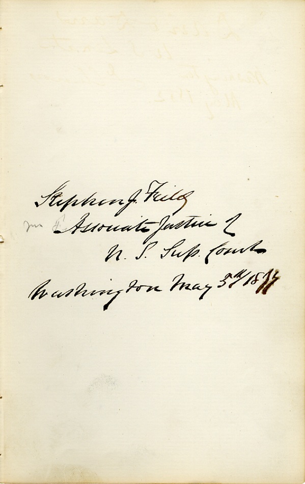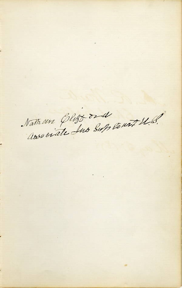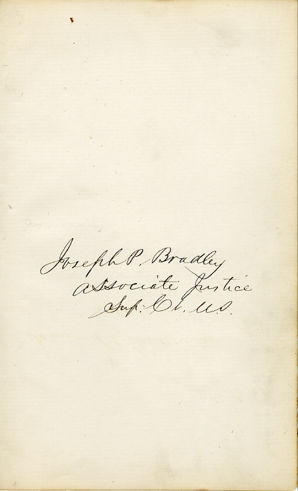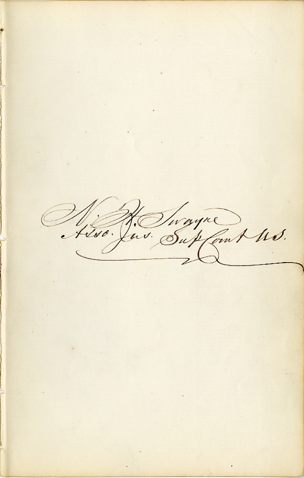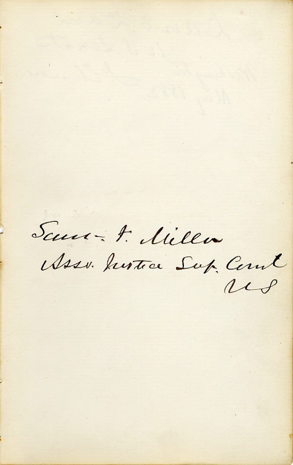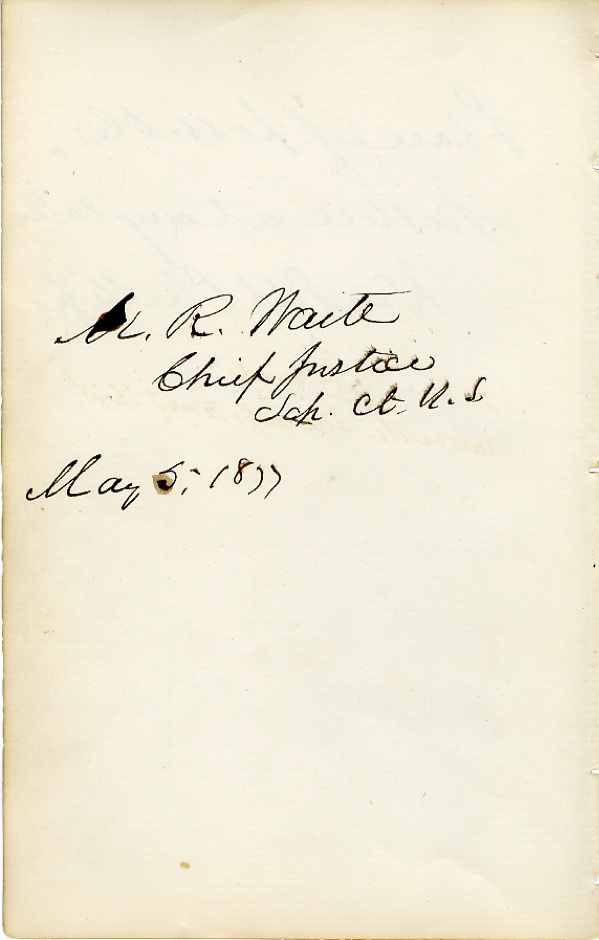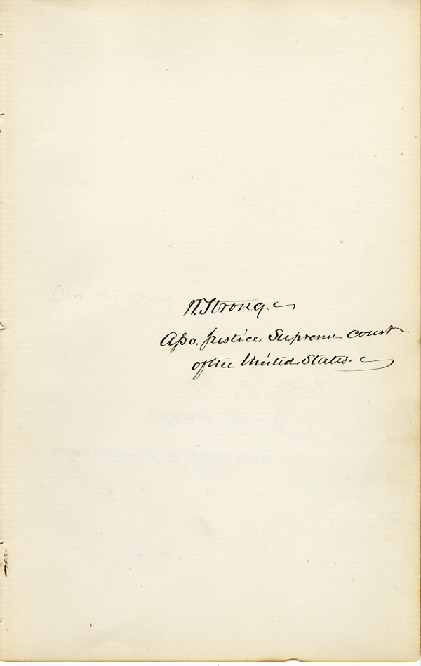 Fountain pen signatures of all nine members of the M. R. Waite Supreme Court on eight off-white 5.5 x 8.5 album pages. Signersa re: M. R. Waite (Chief Justice), Samuel F. Miller, Stephen J. Field, N. H. Swayne, Joseph Bradley, Ward Hunt, Nathan Clifford, Samuel Miller, David Davis and William Strong. Pages are also signed by abolitionist Wendell Phillips and Maj. Gen. James Steadman. One page bears a Justice signature on either side, while remainder are single pages. In fine condition. COA John Reznikoff/PSA/DNA and R&R COA.