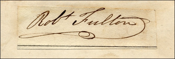 Most famous for having built the steamboat Clermont, which successfully navigated the Hudson against winds and current in 1807; also an accomplished artist. Most famous works are miniature portraits of prominent Philadelphians, including Benjamin Franklin, with whom Fulton associated. Ink signature, “Robt. Fulton,” on an off-white 2.5 x .5 slip affixed to a 3.5 x 1.25 card. Accompanied by an engraved portrait of Fulton, bearing a facsimile signature. Closely trimmed top edge and some light soiling, otherwise fine condition. COA John Reznikoff/PSA/DNA and R&R COA.