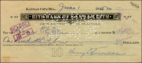 Check, 6.25 x 3, filled out in another hand and signed by Truman, payable to Kansas City Star for $134.40, June 1, 1925. Expected holes and stamps, none affecting the clean signature area, otherwise fine condition. Interestingly, the middle initial “S” is evident on this early check; later it would become less so. R&R COA.
