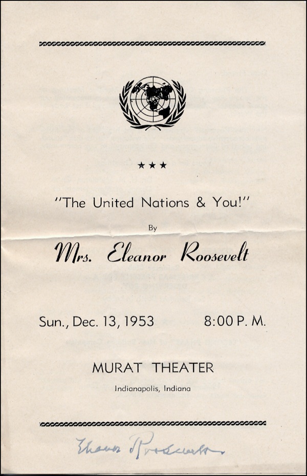 Program from The United Nations And You presentation by Roosevelt, held at the Murat Theater in Indianapolis, Indiana on December 13, 1953, 5.5 x 8.5, two pages. Signed on the front cover in fountain pen “Eleanor Roosevelt.” In fine condition, with several folds and some light handling wear. R&R COA.