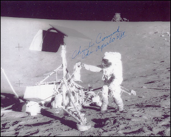 Glossy 10 x 8 photo of Conrad on the lunar surface, signed in blue felt tip, “Charles Conrad, Cdr. Apollo XII.” In fine condition. R&R COA.