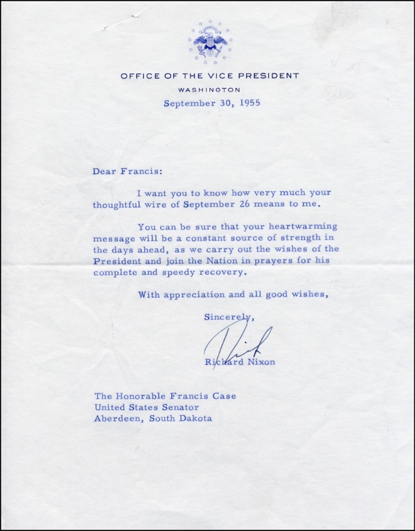 TLS signed “Dick,” one page, 7 x 9, Office of the Vice President letterhead, September 30, 1955. Letter to Senator Francis Case. In part, “You can be sure that your heartwarming message will be a constant source of strength in the days ahead, as we carry out the wishes of the President and join the Nation in prayers for his complete and speedy recovery.” In fine condition, with a single staple hole to top edge and a few light pencil marks. R&R COA.