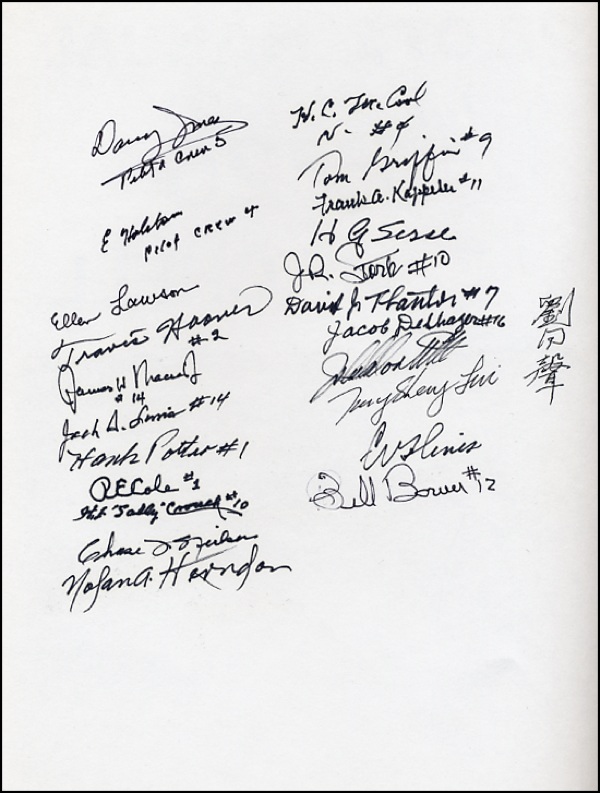 Signed book: Reprinted Pilot’s Manual of Flight Operating Instructions for B-25C and B-25D Models. Appleton, WI: Aviation Publications, 1978. Softcover, 8.5 x 11, 84 pages. Signed on the inside front cover by twenty-three crew members, including: Davy Jones, E. W. Holstrom, Ellen Lawson [wife of pilot], Travis Hoover, James Macia, Jack Sims, Hank Potter, R. E. Cole, H. E. “Sally” Crouch, Chase Nielsen, Nolan Herndon, H. C. McCool, Tom Griffin, Frank Kappeler, H. A. Sessler, J. R. Stork, David Thatcher, Jacob DeShazer, John Doolittle [Doolittle’s son], Tung-Sheng Liu [Honorary Raider], C. V. Gines [author], and Bill Bower. In fine condition, with light age wear. R&R COA.