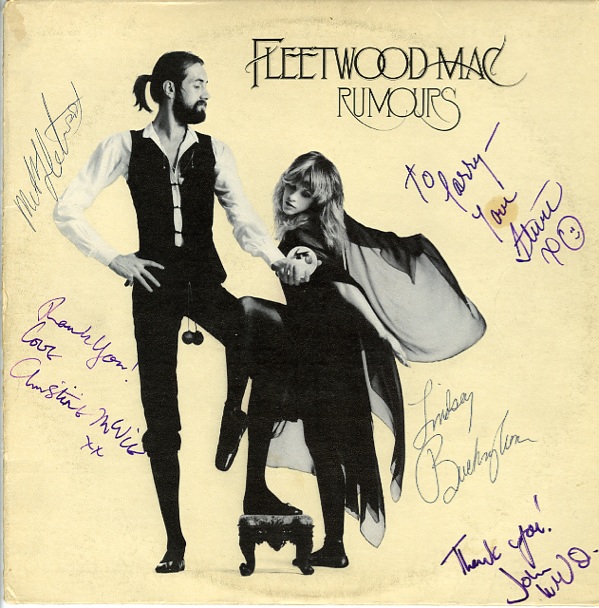 Rumours album signed on the front cover in purple felt tip by Stevie Nicks (ins), “Thank you! Love, Christine McVie,” “Thank you!, John McVie,” and signed in blackball point by Mick Fleetwood and Lindsey Buckingham. Light ‘ring of wear’ to cover and some scattered light soiling, otherwise fine condition. The record is included. COA Roger Epperson/PSA/DNA, COA PSA/DNA and R&R COA.