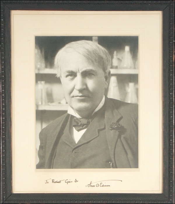 Vintage matte-finish 9.5 x 11.5 portrait photo of Edison in his laboratory, signed and inscribed in the lower border in fountain pen “To Robert Gair, Sr., Thos. A. Edison.” Framed to an overall size of 11 x 13.25. In fine condition. COA John Reznikoff/PSA/DNA and R&R COA.