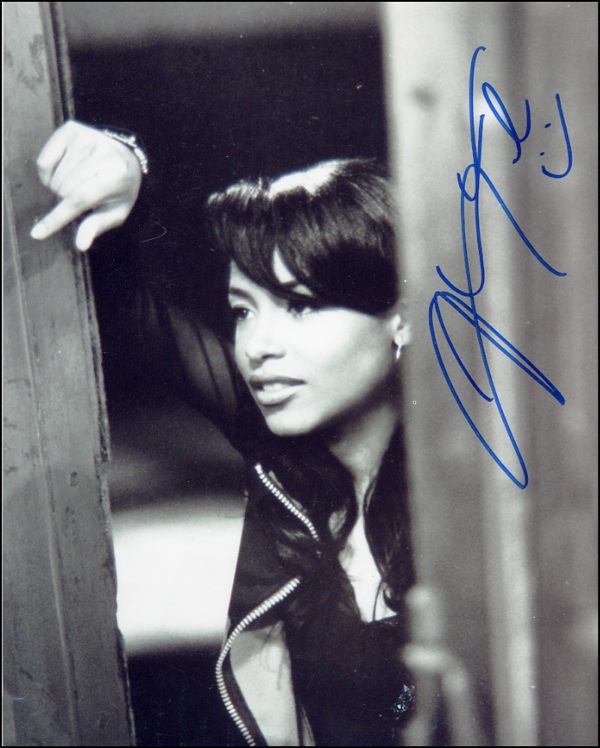 Rising music star who died in a plane crash in August 2001. Glossy 8 x 10 photo of Aaliyah looking from between two posts, signed vertically in blue felt tip. In fine condition, with a few light surface marks. R&R COA.